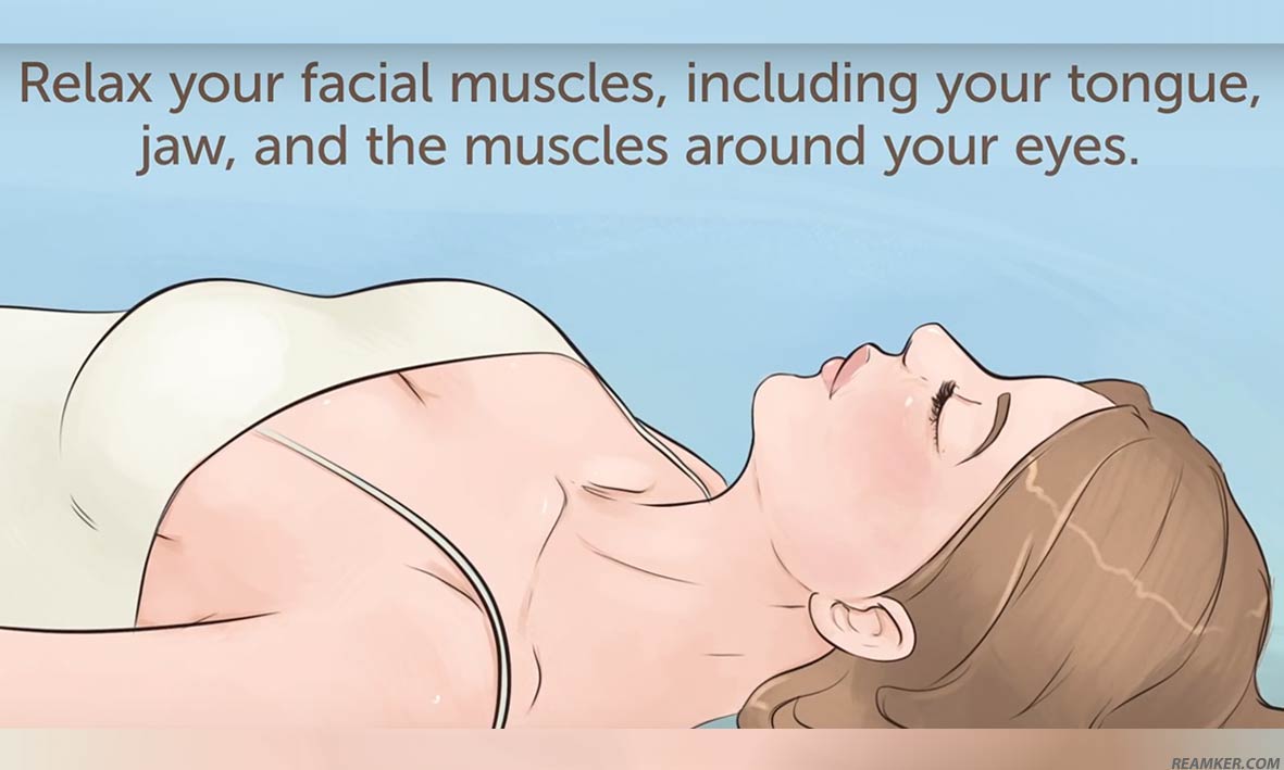 1. តំរេតខ្លួន មុខឡើងលើ ដោយសម្រួលសាច់ដុំមុខ អណ្តាត ថ្គាម និងសាច់ដុំជុំវិញភ្នែក។ បើនៅមានអារម្មណ៍រញ៉េរញ៉ៃ សូមលោកអ្នកព្យាយាមសម្រួល ឬធ្វើឲ្យស្រាលត្រង់ចំនុចកណ្តាលថ្ងាសតែម្តង។ សម្រាប់ទាហាន (ឬសហនាវិក) មិនប្រើគ្រែទេ តែអាចអនុវត្តបានពេលអង្គុយ ទោះក្នុងយន្តហោះ រថភ្លើង រថយន្តក្រុង…។ល។